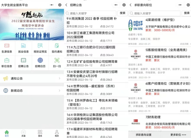 基于“安徽省大学生就业服务平台”,学校坚持“精准化拓展市场、极致化利用资源”的工作方阵,通过多方联系、主动沟通,邀请对口企业平台入驻,对于符合招聘条件企业尽早审核、高效衔接,鼓励合作单位针对学校基本情况和毕业生学科专业设置,拿出合适的、优质的、性价比高的岗位,持续不断为毕业生增加岗位供给。据统计,学校已经为2022届毕业生推送招聘公告1210条,精选招聘岗位30000个,平均为每位毕业生提供6个岗位以上。
