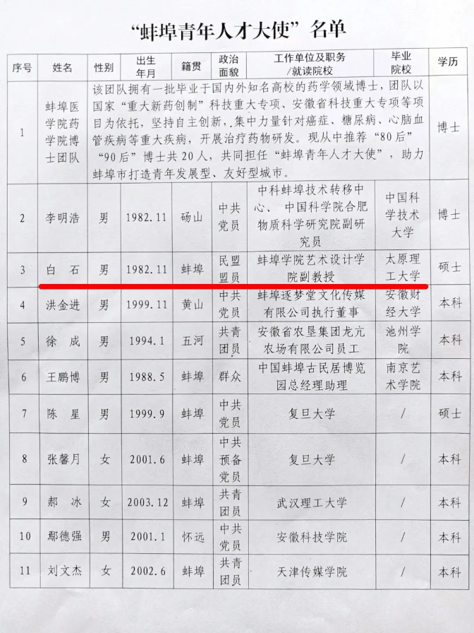 8月18日下午,“雁归珠城•青创未来”蚌埠青年人才家乡行座谈会举行,市委常委、组织部长马天奇出席。座谈上公布了第一批“蚌埠青年人才大使”名单,蚌埠学院艺术设计学院产品实践中心主任、民盟盟员白石位列其中。