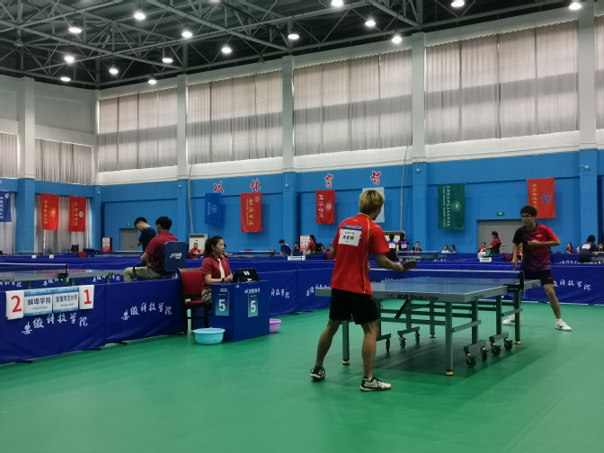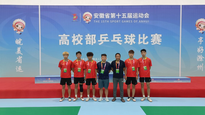 8月24日至29日,由安徽省人民政府主办、安徽省教育厅、安徽省体育局和滁州市人民政府承办的安徽省第十五届运动会高校部乒乓球比赛在凤阳安徽科技学院举行,有来自全省高校40支代表队的477名运动员、教练员和领队参加赛事。我校代表队由体育教学部王建、陈立松老师担任教练,带领五名同学参加比赛。
