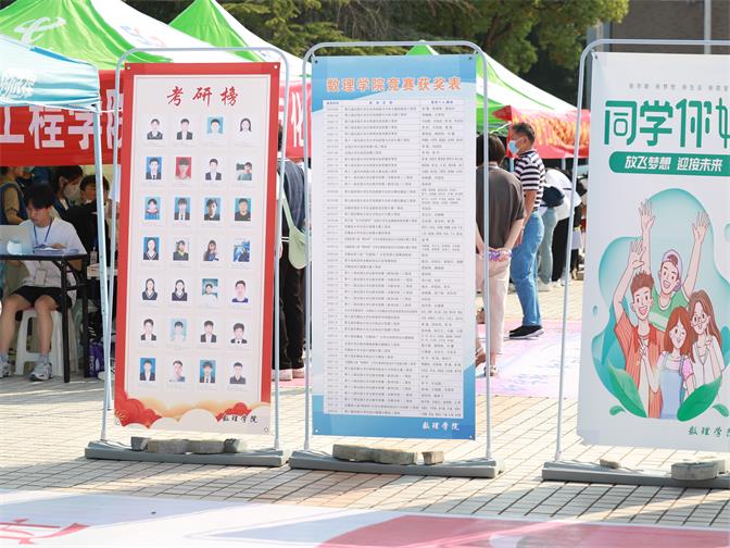 从踏入校门开始,道路两旁各二级学院帐篷林立。远远望去,入眼的是北侧摆成一排的2022届优秀毕业生风采栏,这是机械与车辆工程学院的光荣榜,也是他们对于新生的一种激励。数理学院放置了“考研榜”、“竞赛获奖表”,令新生在进校之初就直观感受到勤学刻苦、努力拼搏的教风学风。
