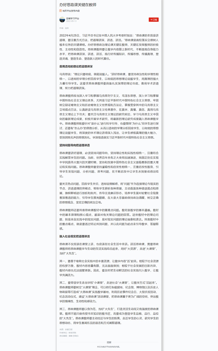 2022年9月13日,我校马克思主义学院朱林老师撰写的理论文章《办好思政课关键在教师》被学习强国安徽平台首页全文转载。