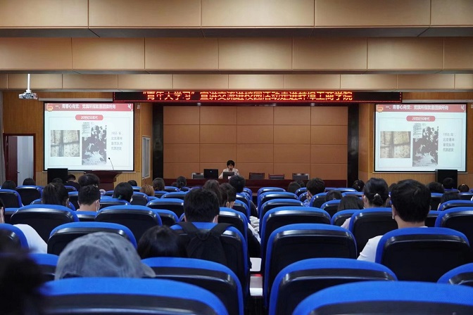 王昆仑宣讲的主题是:“青春谱华章 百年再起航——学习习近平总书记在庆祝中国共产主义青年团成立100周年大会上的讲话”。王昆仑从“青春心向党:党旗所指就是团旗所向”“青春谱华章:建团百年积累宝贵经验”和“扬帆再起航:习近平总书记对共青团和青年工作的总结与展望”三个方面向蚌埠工商学院180余名师生生动讲述了中国青年运动百年来波澜壮阔的历程,深刻指出共青团在百年征程的不同时期形成的宝贵经验。