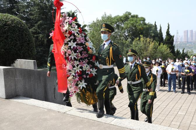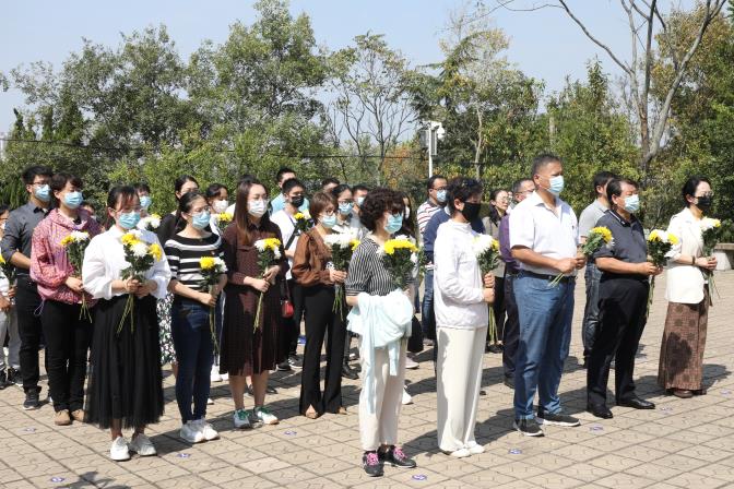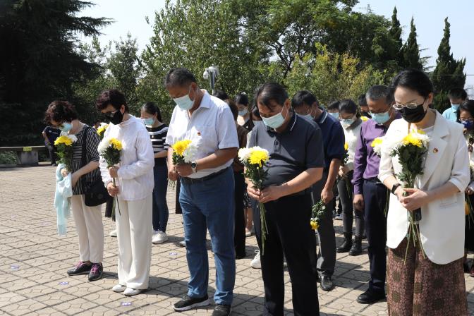 进入烈士陵园,大家都被陵园中庄严肃穆的气氛所感染。国旗护卫队迈着庄严的步伐,护卫花篮缓缓入场。“苟利国家生死以,岂因祸福避趋之”,在此安息的烈士为了民族的解放、国家的独立、人民的幸福,奉献了自己的一生。在国歌齐唱中,每一位在场同志都回忆起了那一段烽火年代。唱毕,全体成员在纪念碑前默哀,寄托着对烈士无限的追思、缅怀与敬意。