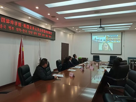 会议第一阶段,双方校领导分别致辞并交流。陈国龙介绍了蚌埠学院的学科专业、产教融合人才培养和对外开放办学方面取得的成就。他表示两校的合作,将加深双方在共同学科领域的交流探讨,加强师生之间的互动了解,这必将会进一步推动两国在教育领域的合作。朴鲁俊介绍了安养大学的发展以及与中国的教育交流,他表示安养大学将把此次会议作为新的起点,深化两校未来的合作。之后陈国龙和安养大学朴鲁俊签订了两校合作协议,正式确定了两校的合作关系。