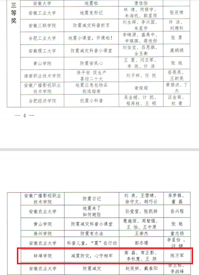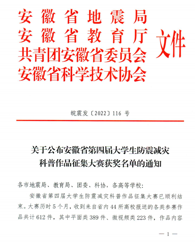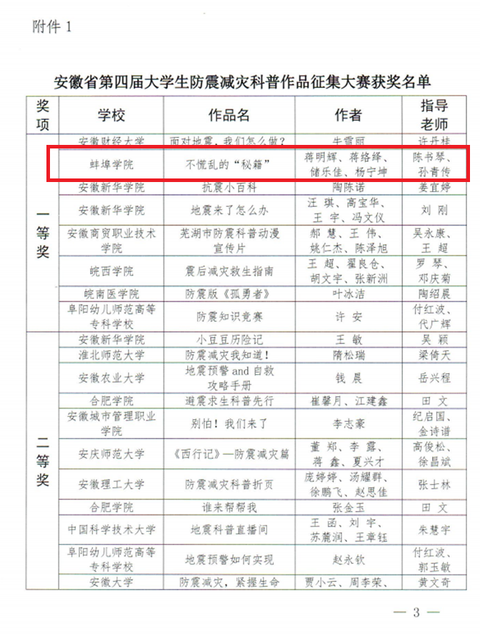 近日,由安徽省地震局、安徽省教育厅、共青团安徽省委员会和安徽省科学技术协会共同举办的第四届大学生防震减灾科普作品征集大赛获奖名单公布,我校文学与教育学院作品《不慌乱的“秘籍”》(作者:蒋明辉,蒋络绎,储乐佳,杨宁坤,指导老师陈书琴、孙青传)获得一等奖,土木与水利工程学院作品《减震防灾,心守相牢》(作者:高磊,常正影,李秋慧,王颜,指导老师陈万军)荣获三等奖。
