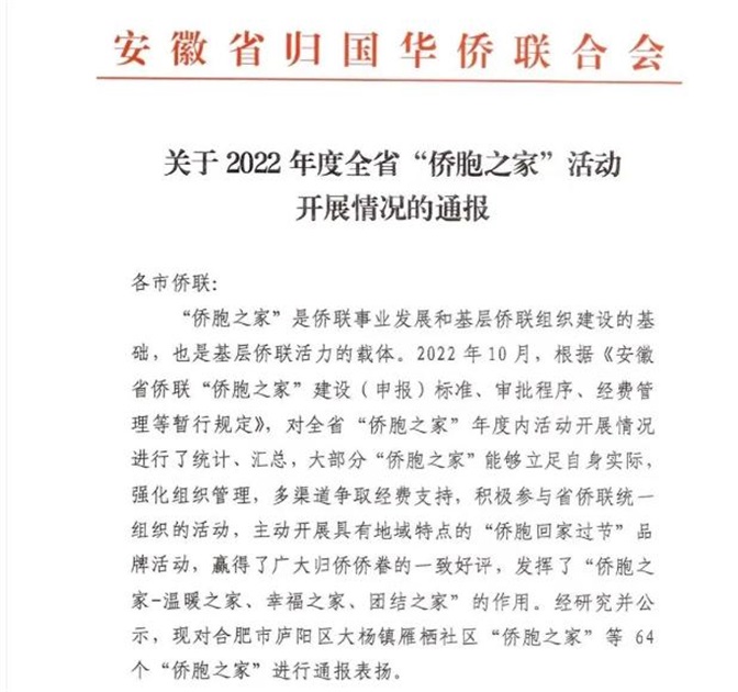 近日,安徽省归国华侨联合会印发了《关于2022年度全省“侨胞之家”活动开展情况的通报》,对2022年度全省64个“侨胞之家”开展情况进行通报表扬,我校“侨胞之家”位列其中。