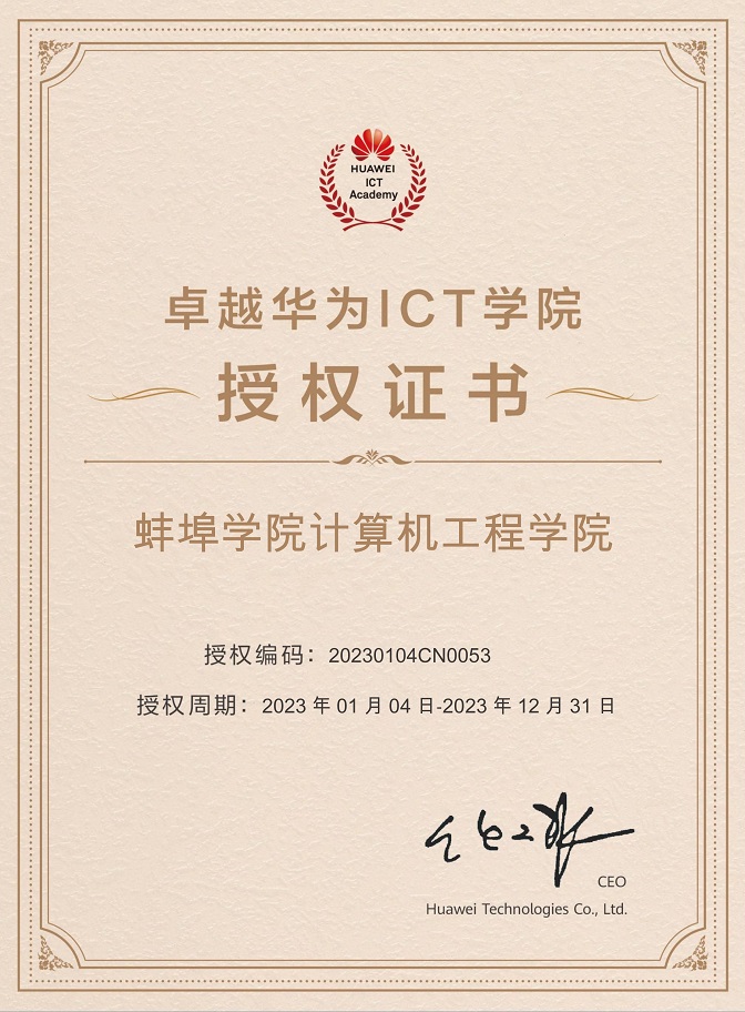2023年1月,华为技术有限公司根据2022年度蚌埠学院在网络方向的建设成果、认证讲师数及认证的学生数等指标,决定将蚌埠学院ICT学院升级成为华为卓越ICT学院,这是蚌埠学院在取得2020年度全国优秀ICT学院称号后获得的又一个荣誉。