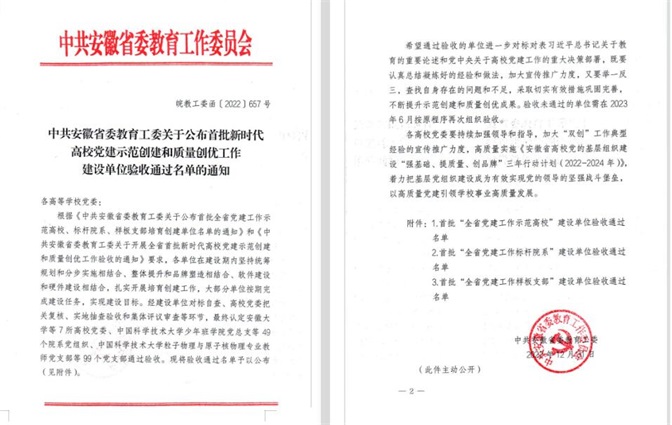 近日,中共安徽省委教育工委公布了首批新时代高校党建示范创建和质量创优工作建设单位验收通过名单。我校材料与化学工程学院党委顺利通过省级首批党建工作标杆院系验收,马克思主义学院直属教师党支部等3个党支部通过省级党建工作样板支部验收。