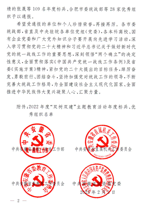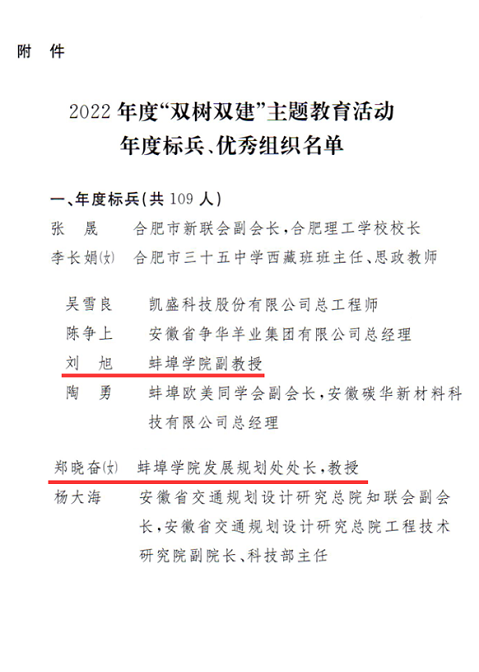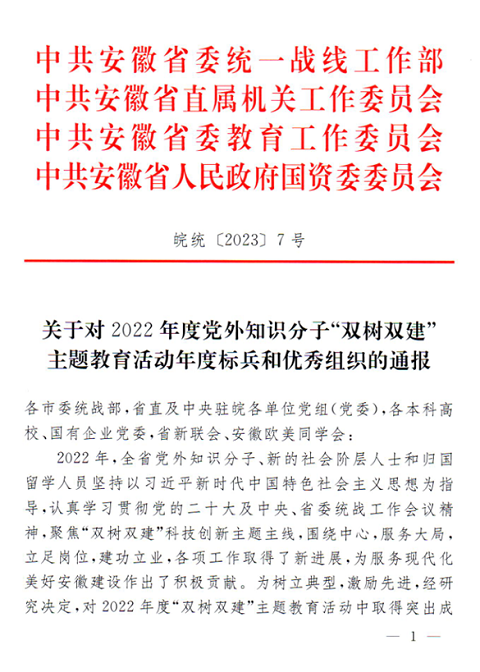 近日,中共安徽省委统战部、省直机关工委、省教育工委、省国资委联合发文,对2022年度党外知识分子“双树双建”主题教育活动年度标兵和优秀组织进行表彰,我校郑晓奋、刘旭两位党外人士双双荣获年度标兵荣誉称号。