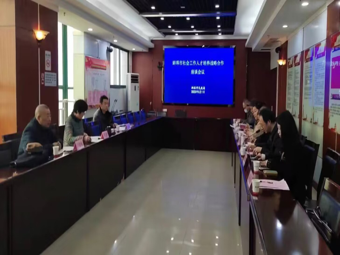 3月1日上午,蚌埠开放大学与蚌埠市民政局举行蚌埠市社会工作人才培养战略合作座谈会。安徽开放大学开放学院院长、安徽民政开放学院院长刘盛峰,安徽民政开放学院副院长周军,蚌埠市民政局党委委员、市社会救助服务管理中心主任张群,蚌埠市民政局慈社科科长王佳,蚌埠开放大学党总支书记凌宏等参加会议并进行深入的交流。
