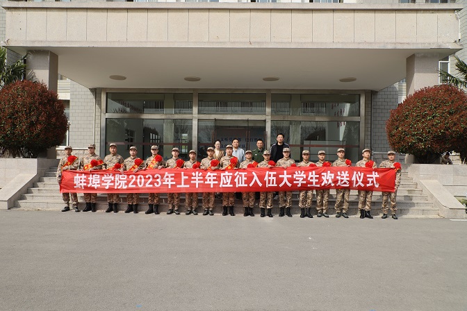 3月15日下午,蚌埠学院举行2023年上半年应征入伍学生欢送仪式,为18名即将踏上军旅征程的优秀学子送行。校党委副书记韦文联出席欢送仪式,蚌山区人武部部长曾鸣、党委学生工作部部长赵思莉及相关征兵工作人员参加了欢送仪式。仪式由党委学生工作部部长赵思莉主持。