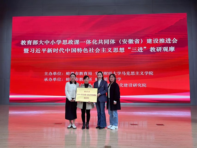 会上,省教育厅思政处王后林处长为教育部大中小学思政课一体化共同体建设单位(安徽省)授牌,蚌埠学院马克思主义学院副院长魏雪梅代表学校接受授牌。之后,教育部大中小学思政课一体化共同体建设成员单位汇报交流;来自蚌埠大中小学的优秀思政课教师同台进行思政课展示与思政课说课观摩。其中蚌埠学院马克思主义学院吴国莎老师就“习近平新时代中国特色社会主义思想概论”课程中“扎实推动全体人民共同富裕”主题进行了说课展示,获得了与专家的高度肯定。