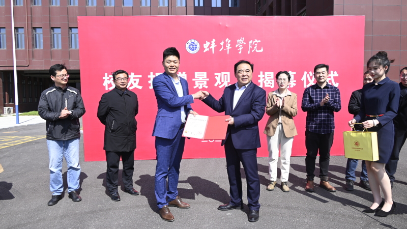 捐赠的景观石采自灵璧,高约3.5米,重达5吨,正面镌刻着“立德树人”字样,是学校践行“立育人之德 树有德之人”的体现,彰显了我校“笃学 重行 修德 立才”的校训精神。校党委副书记韦文联和校友陈伦权共同为校训石揭幕,向陈伦权颁发捐赠证书及纪念品并合影留念。