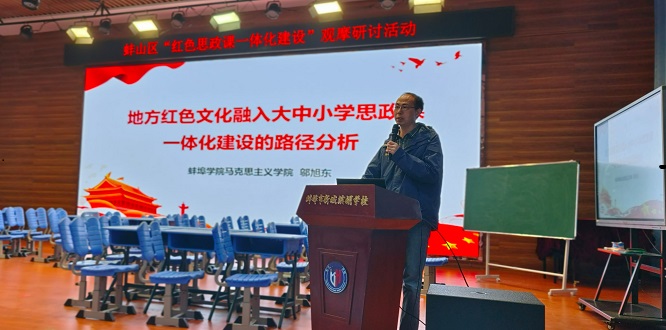 为深入学习和贯彻落实习近平总书记关于红色文化系列重要讲话精神,将红色文化融入大中小学思政课一体化建设之中,推进大中小思政课一体化共建进程,2023年4月13日,由蚌山区教体局主办的“红色思政课大中小一体化建设”观摩研讨活动在蚌埠新城滨湖学校初中部报告厅开展。蚌山区中小学思政课教师参会。蚌埠学院马克思主义学院院长邬旭东、思政课教师汪淼应邀参会。邬旭东在研讨会上作交流发言。汪淼老师进行了青春思政课课例展示。