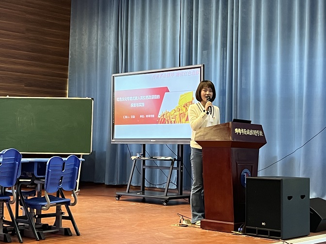 随后,来自蚌山区中小学的三位优秀教师分别进行了思政课现场教学和音乐思政课展示。汪淼老师以《红色文化专题式嵌入高校思政课程的探索与实践》为题进行了说课展示。