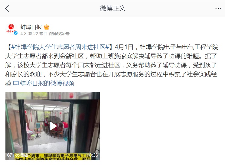 近日,蚌埠日报以“蚌埠学院大学生志愿者周末进社区”为主题对我校大学生志愿者爱心支教活动进行了采访,并在新媒体平台上开展报道。