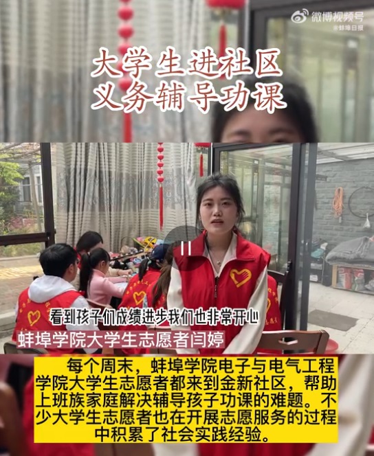 蚌埠学院电子与电气工程学院自2015年开始,连续八年组织开展大学生志愿者周末进社区义务支教活动,帮助上班族家庭解决辅导孩子功课的难题,受到孩子和家长的欢迎。志愿者们帮助小朋友解决语文、数学、英语等学科问题,并且对小朋友较为薄弱的学科进行了试卷批改和专题讲解,给孩子们带来了更多的学习机会和拓展视野的渠道。金新社区副书记姜丽莉在采访中表示,大学生志愿者利用周末休息时间,持续走进金新社区开展义教志愿服务活动,为社区里的孩子们进行学习指导,孩子们也在志愿者的辅导下,学习日益进步、取得了良好的学习成绩,感谢大学生志愿者的热心付出。