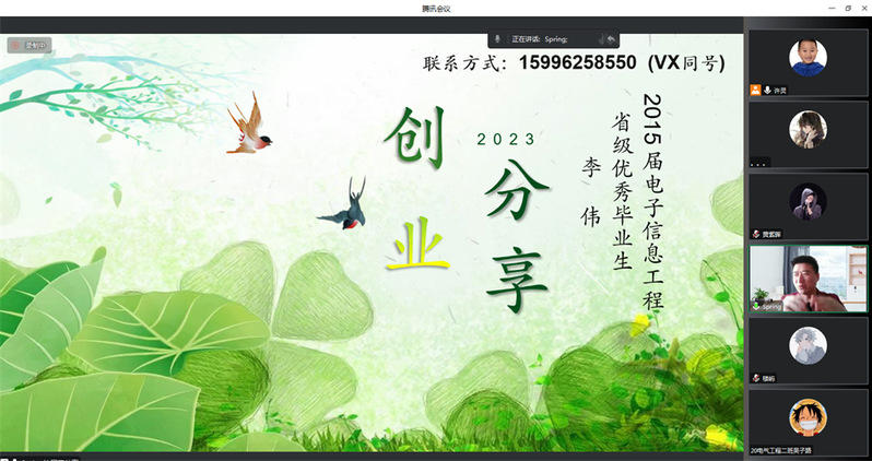 李伟是我校电子与电气工程学院2011级电子信息工程专业省级优秀毕业生,2015年毕业后与人合伙先后创办河南仁美家居用品有限公司和绍兴超谦家居用品有限公司。他以自身发展经历为主线,分享了自己大学期间充实而难忘的学习生活,自己的考研和求职经历,在人生路口面临抉择时自己毅然选择艰难创业的心路历程,以及创业后自己的职场感悟,建议同学们在校期间要要树立合理目标,努力学习掌握专业知识,重视课外实践和身体锻炼。在未来工作中坚持学习、积累经验、奋勇拼搏,善于发现并把握机遇,走出自己的舒适区,珍惜时光、怀抱梦想,不负青春,成就出彩人生。
