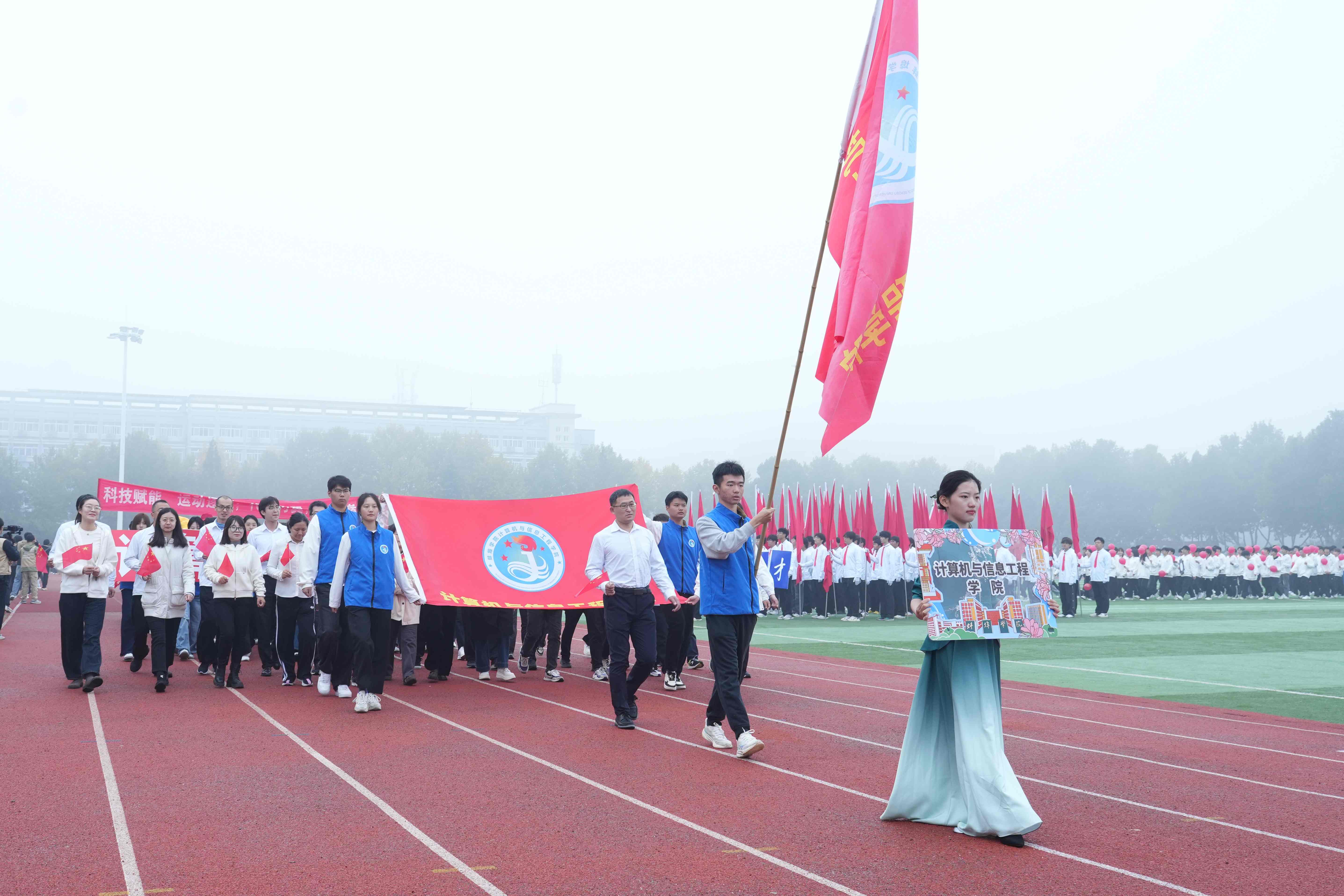 机械与车辆工程学院方阵以智造未来,精工笃行为信念,用国旗、气球与中国大字交织成炽热的中国红;电子与电气工程学院方阵步伐整齐,精神抖擞,以昂扬姿态诠释体育精神;食品与生物工程学院身着绿色统一服装,彰显食品安全理念,敢拼搏,燃赛场的口号响彻云霄;计算机与信息工程学院百余名学子手持键盘模型,展现代码织梦、技术创未来的专业特色。