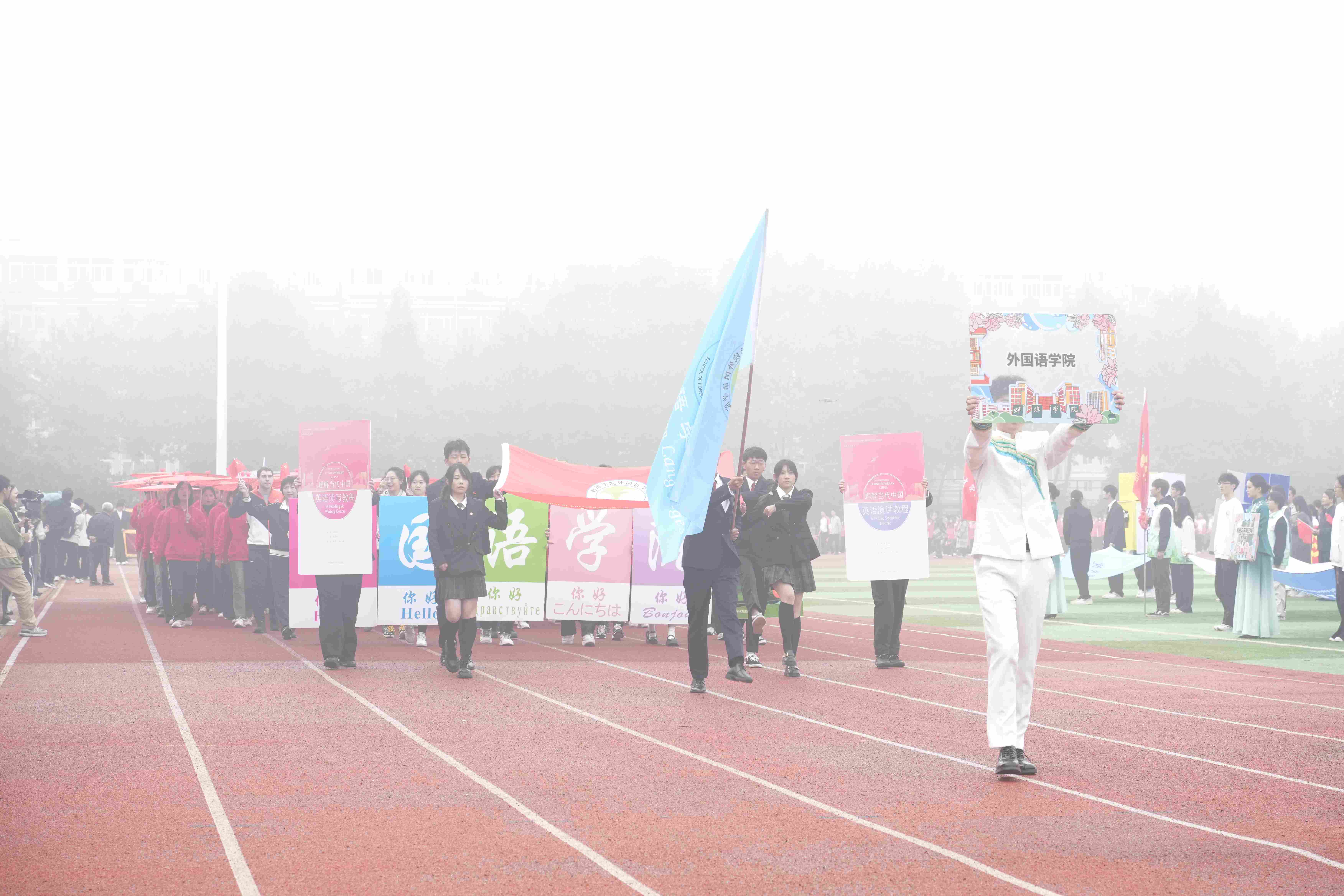 在雄壮的进行曲中,四位旗手护卫着鲜艳的五星红旗率先入场。紧随其后的红旗方阵,白衫红领,步伐铿锵,瞬间点燃全场热情。各学院方阵依次亮相,展现出独特的专业特色与青春朝气。