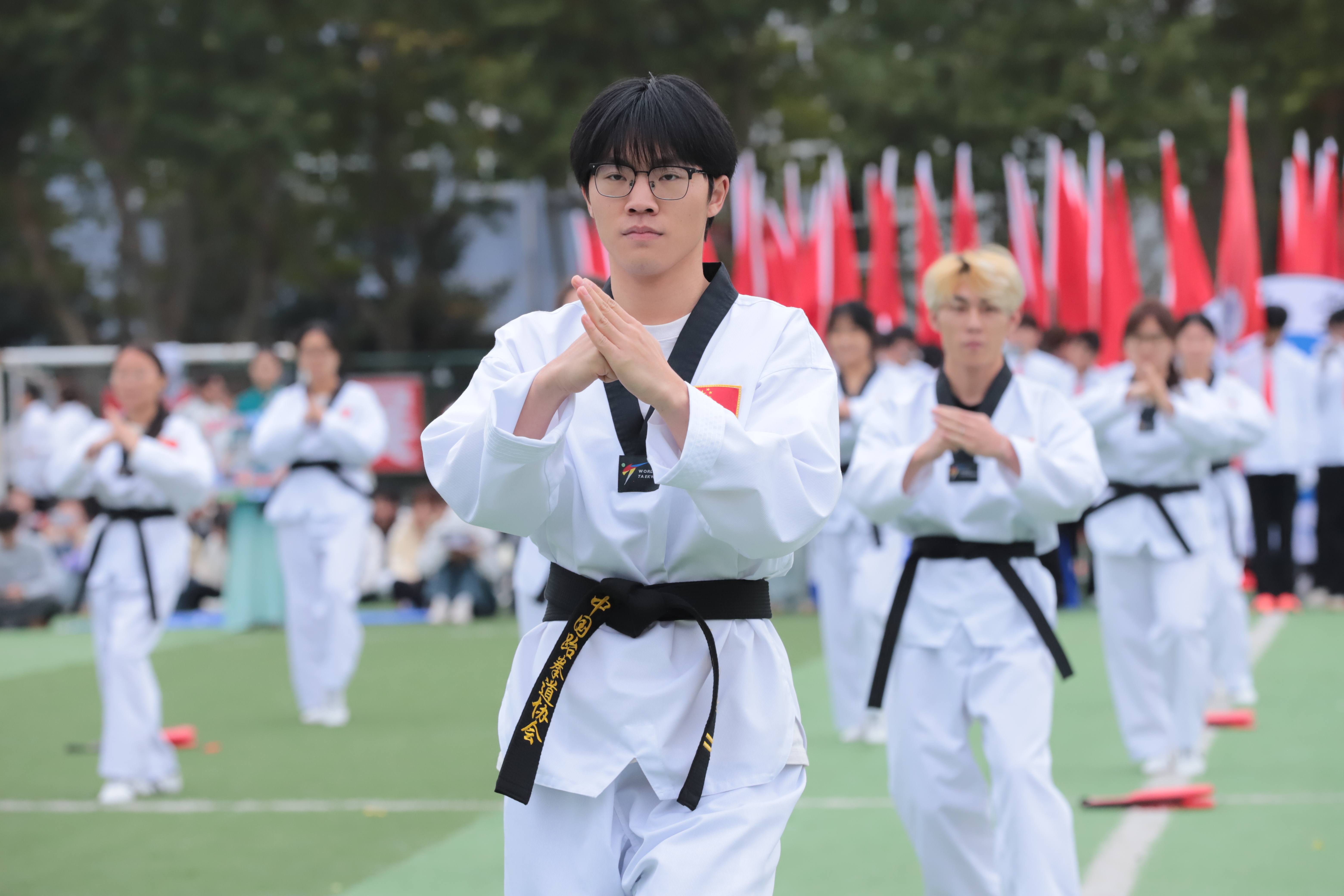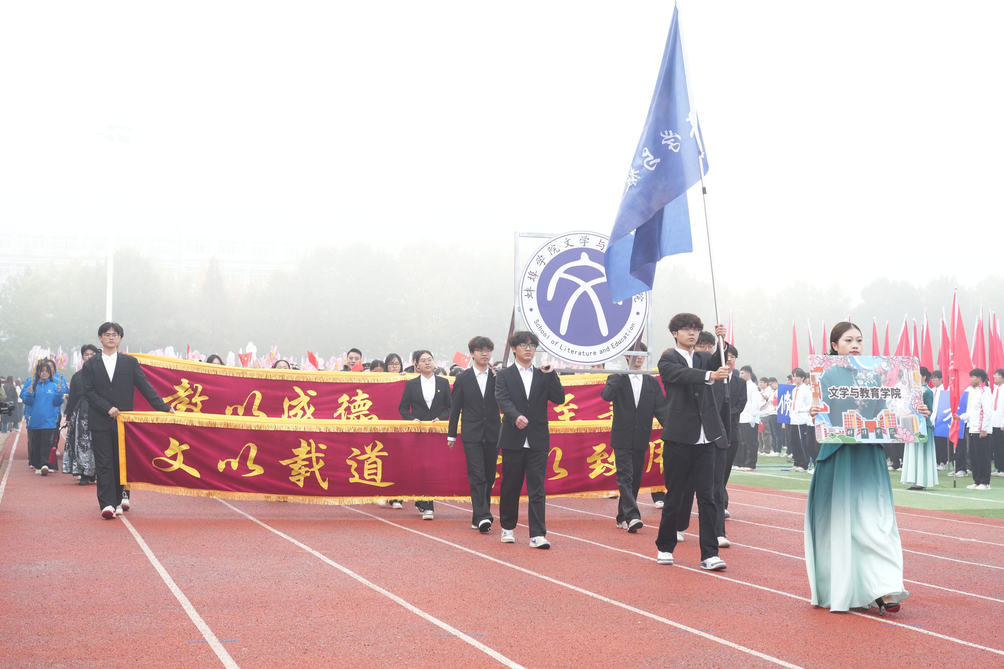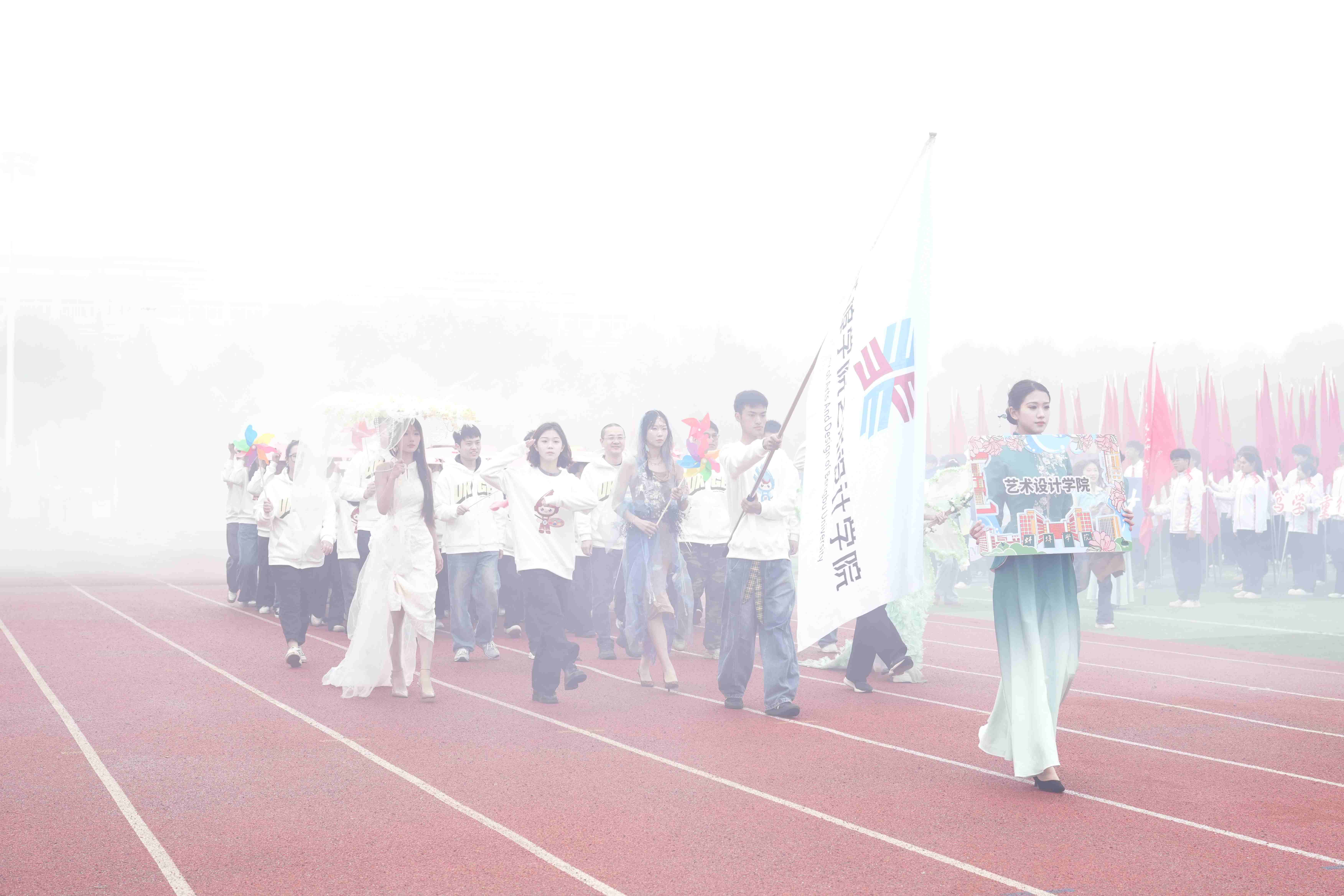 经济与管理学院方阵挥舞蓝黄花球,变换出寓意奋进的冲字造型;艺术设计学院将环保理念融入创意设计,展现美育成果;外国语学院方阵以红色伞阵组成巨幅国旗,彰显爱国情怀;文学与教育学院身着汉服,手捧鲜花,展现中华文化的深厚底蕴;音乐与舞蹈学院方阵踏着鼓点韵律,将赛场化作活力舞台;应用技术学院步伐铿锵,目光如炬,展现工匠精神。最后,裁判员方阵庄严入场,承诺将恪守职业道德,确保赛事公平公正。