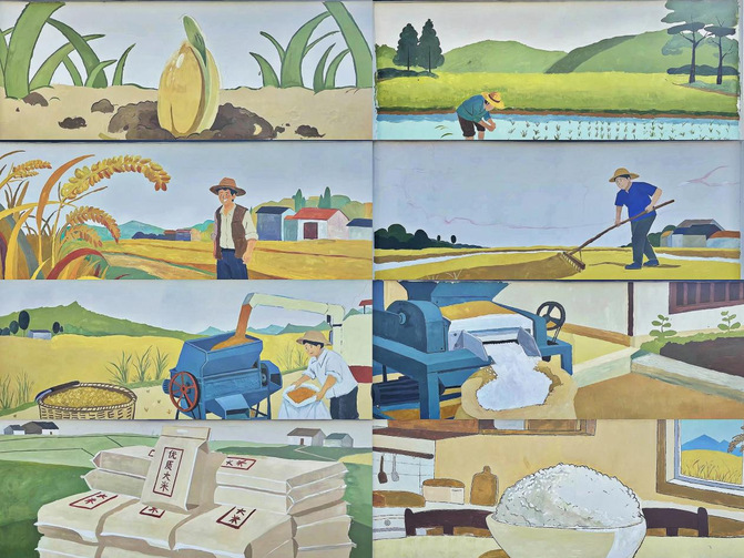 作为学院“美育+思政+志愿服务”三位一体实践模式的重要延伸,此次活动紧扣“虹色经纬”品牌理念,将党建引领与专业实践深度融合。活动前期,师生团队多次深入燕山乡实地调研,挖掘淮河农耕文化底蕴与江淮稻香体验中心的产业特色,将稻浪翻滚的田园景致、科技助农的发展成果与新时代文明新风尚有机融入设计方案,最终确定“稻穗飘香”“科技兴农”“乡村新貌”三大主题创作板块。绘制现场,志愿者们化身乡村美容师,或蹲或站、分工协作,从起稿勾勒到上色渲染,在冬日寒风中专注投入,用细腻笔触与鲜活色彩,让原本单调的墙面蜕变为兼具美学价值与文化内涵的风景线,既再现了淮河流域的农耕诗意,更传递了乡村振兴的奋进力量。