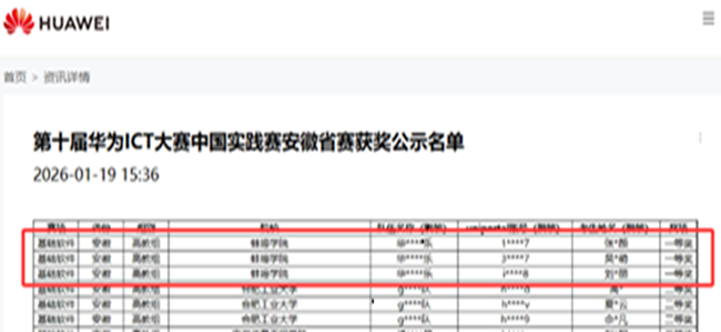 本届华为ICT大赛赛制迎来调整,由原“个人初赛—团队决赛”模式全面升级为全程团队赛,对竞赛备训工作提出了更高要求。面对赛制变化带来的备训压力,网络工程教研室主动作为、攻坚克难,精准分析赛情与学情,科学指导学生组队,针对性开展赛前集训。最终,学子们凭借扎实的技术功底、良好的团队协作能力与优秀的职业素养,在安徽赛区网络、基础软件、昇腾AI三大赛道决赛中斩获佳绩,共摘得一等奖6项、二等奖7项、三等奖7项,获奖等级与获奖数量均居全省本科高校首位;其中,斩获网络与基础软件赛道第一名的队伍,将代表安徽省本科高校出征3月底举行的全国总决赛。