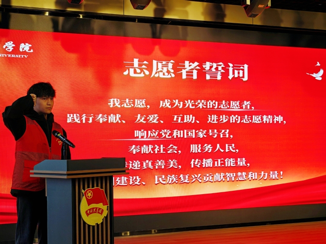 活动伊始现场播放2025年志愿服务活动总结视频一幕幕暖心的服务画面生动展现了蚌院志愿者的责任与担当也让在场人员重温了志愿服务的温暖与力量青志联副会长陈炜琪作为志愿者代表宣读《学雷锋志愿服务倡议书》,发出践行雷锋精神积极参与志愿服务的号召,呼吁全校青年学子以实际行动传承志愿精神校学生会主席魏修洋带领全体志愿者庄严宣誓,铿锵的誓言彰显着志愿者们践行初心、无私奉献的坚定决心。