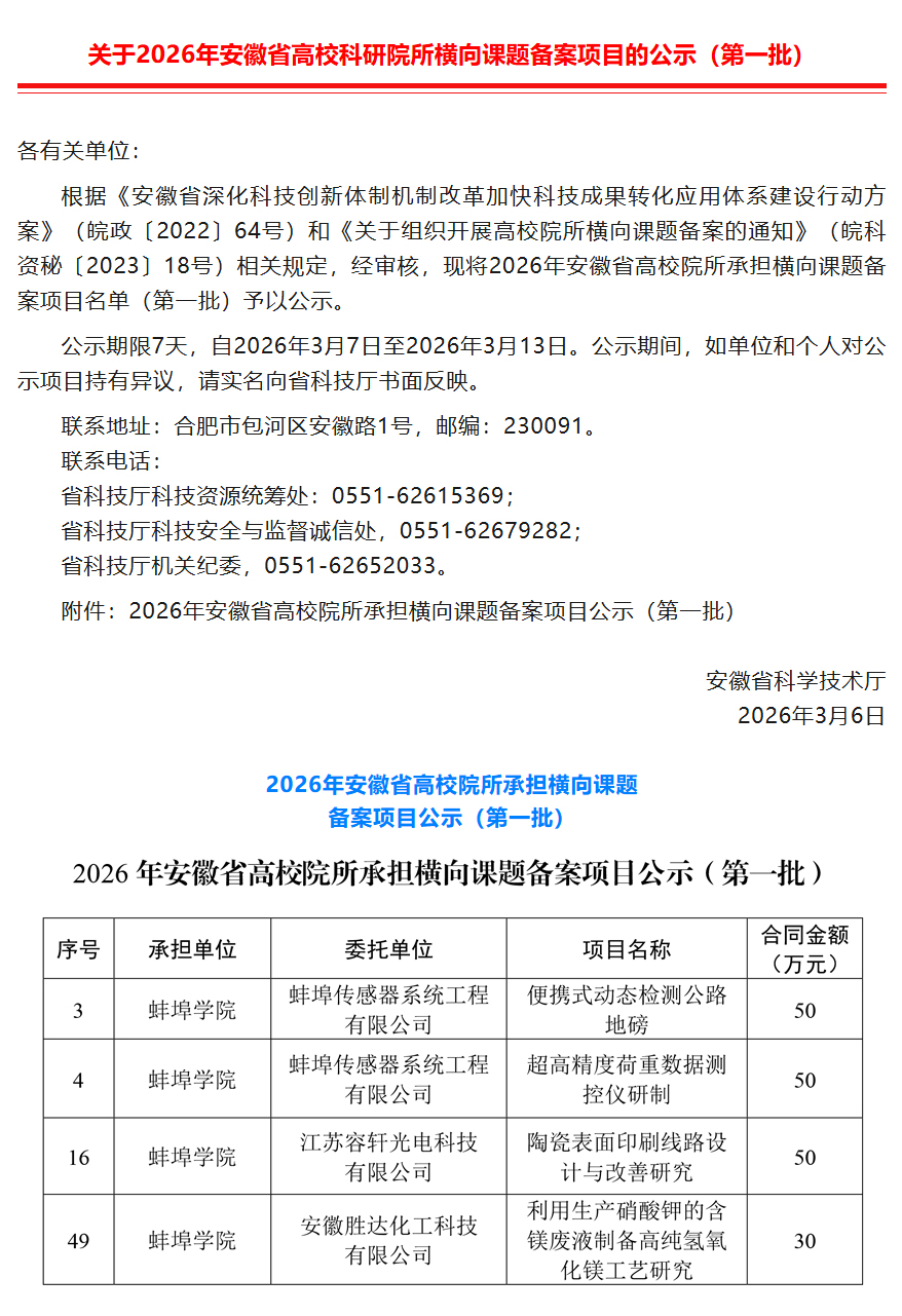 日前,省科技厅发布2026年第一批安徽省高校科研院所横向课题备案项目立项计划,我校“便携式动态检测公路地磅”等四个项目成功入选,按照政策可视同为省重点研究与开发计划项目,这是我校首次入选该计划,标志着我校产学研合作及科技成果转化工作取得重要突破。