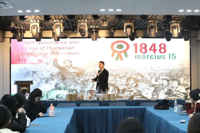 活动现场,匈牙利约翰·冯·诺伊曼大学卡帕缇·约瑟夫博士应邀为全场师生带来专题讲座。卡尔帕蒂博士围绕匈牙利历史发展、文化特色、民俗风情与人文精神进行细致讲解,以生动的语言、详实的资料带领大家深入了解多瑙河畔的文化国度,让在场师生对匈牙利文化有了全面而深刻的认识,讲座内容兼具知识性与趣味性,赢得现场阵阵掌声。