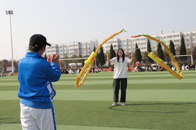 观摩环节结束后,各学院学子纷纷前往心仪展区,在专业教师的耐心指导下,亲手尝试空竹、礼射、健身鞭、舞龙等项目,从最初的好奇摸索到逐步熟练体验,在亲身实践中领略民族传统体育的独特乐趣。2024级水利水电工程1班许文豪、项嘉炜和王琰三位同学对礼射很感兴趣,“第一次接触礼射,不仅学会了基本的搭弓射箭动作,还了解了背后的文化内涵,特别有意义。”2025级汉语言4班王莹、李亚楠两位同学则在五禽戏展区模仿起了虎、鹿、熊、猿、鸟的动作,“当我专注模仿动物神韵时,大脑好像会暂时放下压力,自然引导身体进入一种舒展的状态”。