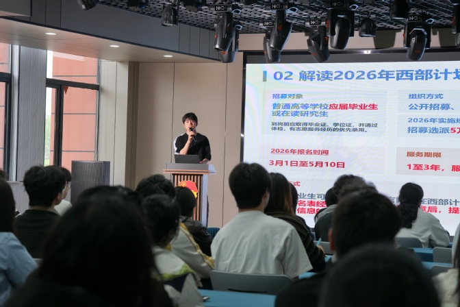 宣讲会上,赵成明结合自身服务经历,从重温习近平总书记重要回信精神、2026年西部计划实施方案、服务实践和工作感悟等方面展开全面分享。他详细介绍了西部计划招募对象、组织方式、服务期限、岗位导向、报名流程等核心内容,清晰解读服务期满后的利好政策,帮助同学们全面了解项目体系与保障机制。