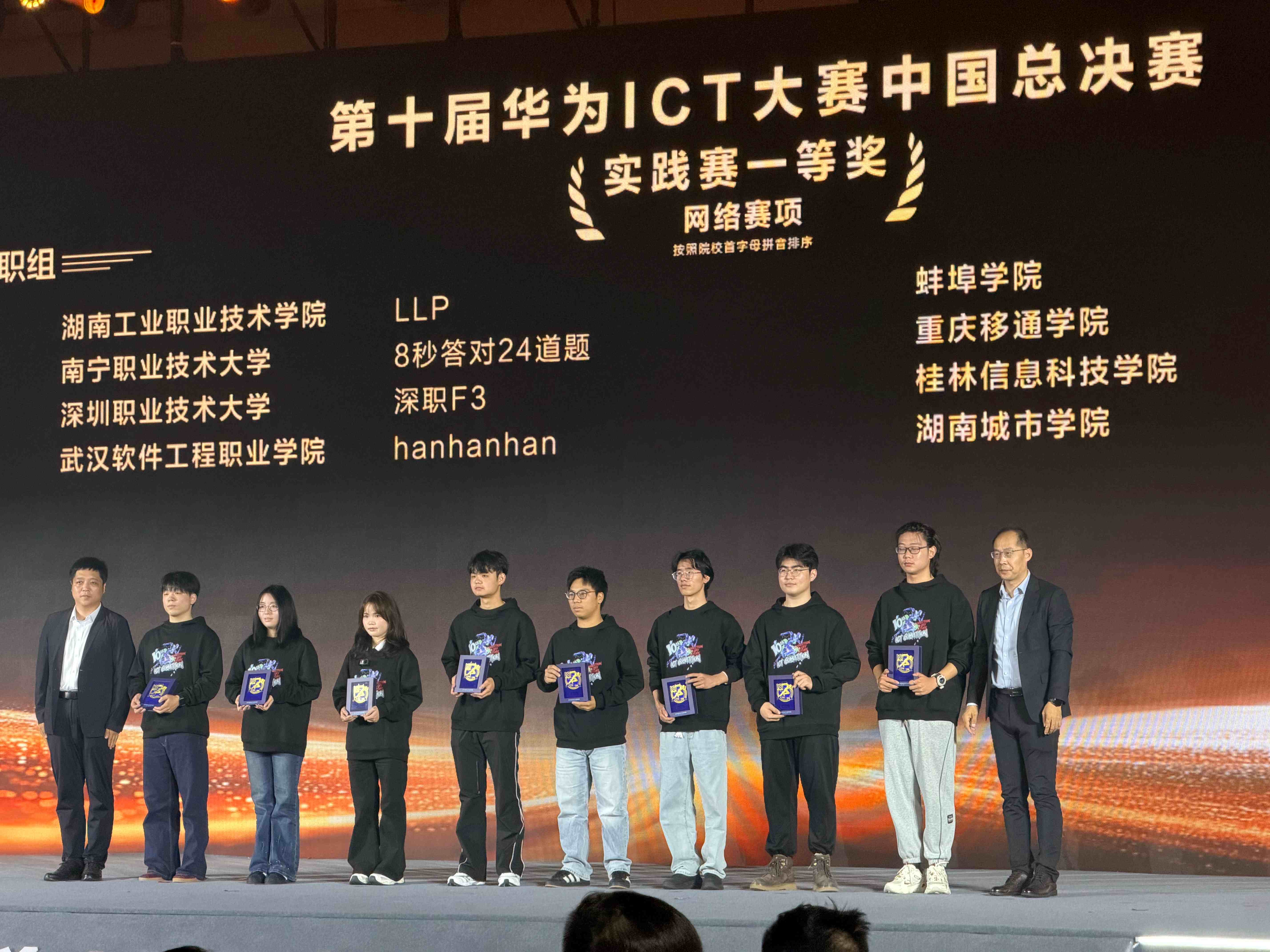 4月19日,第十届华为ICT大赛中国总决赛闭幕式暨颁奖典礼在华中科技大学光谷体育馆隆重举行。蚌埠学院计算机与信息工程学院2023级网络工程专业李永坤、刘欣冉、蔺梦婷组成的“从容应队”(指导教师:网络工程教研室肖宇、丁智),凭借坚韧拼搏的出色表现,斩获实践赛网络赛道本科组全国总决赛一等奖。