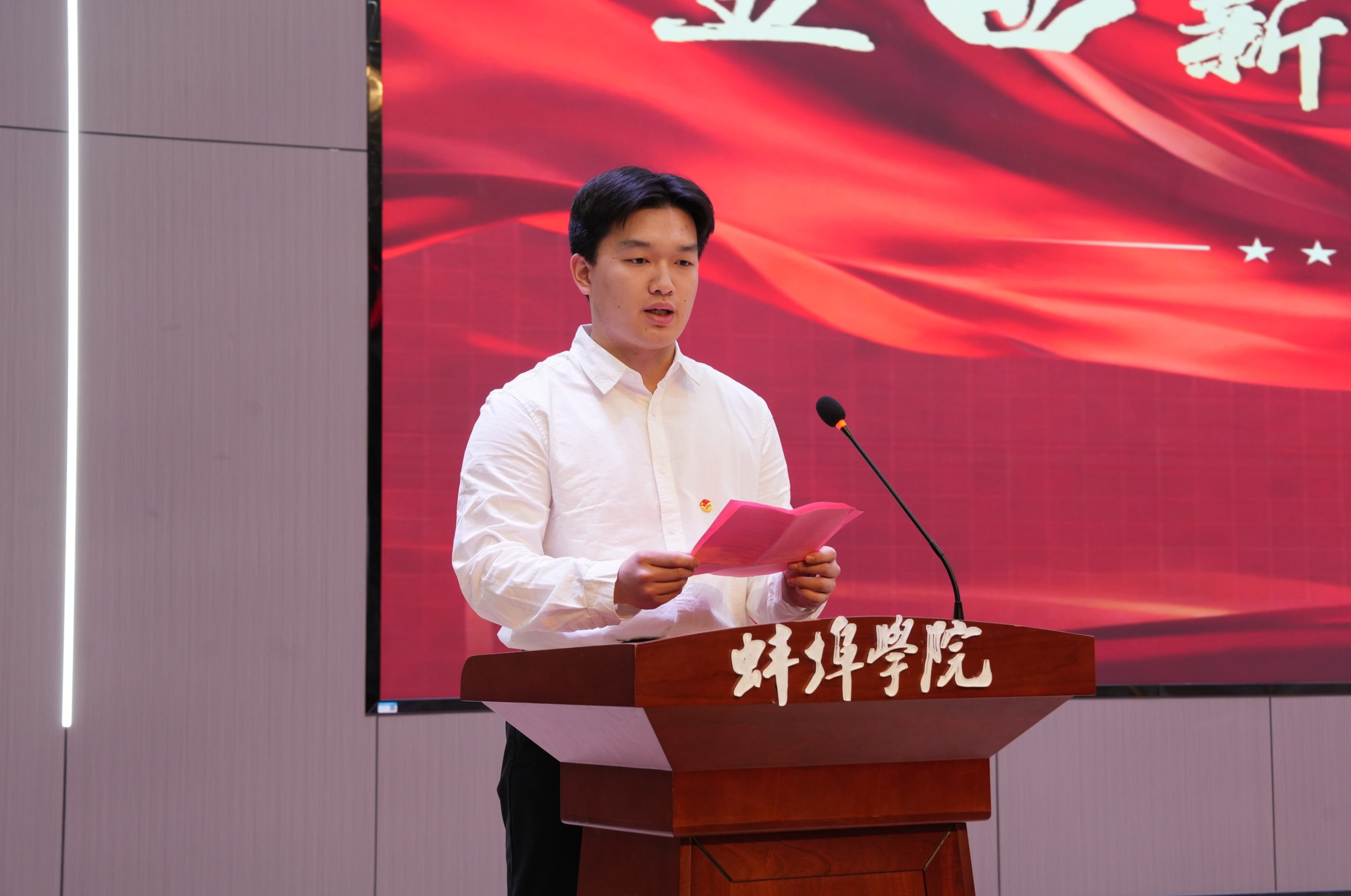 学校党委副书记方贤文讲话,他回顾五四精神的时代价值,结合“十五五”发展新征程,对全体团员青年提出三点希望:一是以青春之信仰筑牢思想之基,坚定听党话、跟党走;二是以青春之本领锤炼过硬之才,珍惜学习时光、提升综合素养;三是以青春之担当书写奋进之篇,将个人成长融入国家发展与学校建设。方贤文表示,学校将全力为青年成长成才搭建平台、提供保障,助力蚌院青年在青春赛道上奋力奔跑。