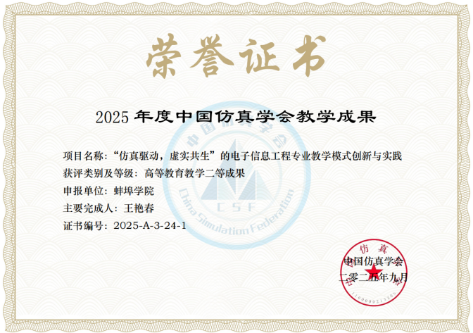 近日,以“数智仿真、新质发展”为主题的第三十七届中国仿真大会在安徽合肥落下帷幕。蚌埠学院电子与电气工程学院院长王艳春教授牵头,罗少轩、刘国永、董坤、苏浩等教师共同完成的教学成果“‘仿真驱动、虚实共生’的电子信息工程专业教学模式创新与实践”,荣获高等教育教学成果二等奖。这一成绩充分彰显了学校在数智化教学改革与创新工程人才培养方面取得的显著成效,获得国家级学会高度认可。